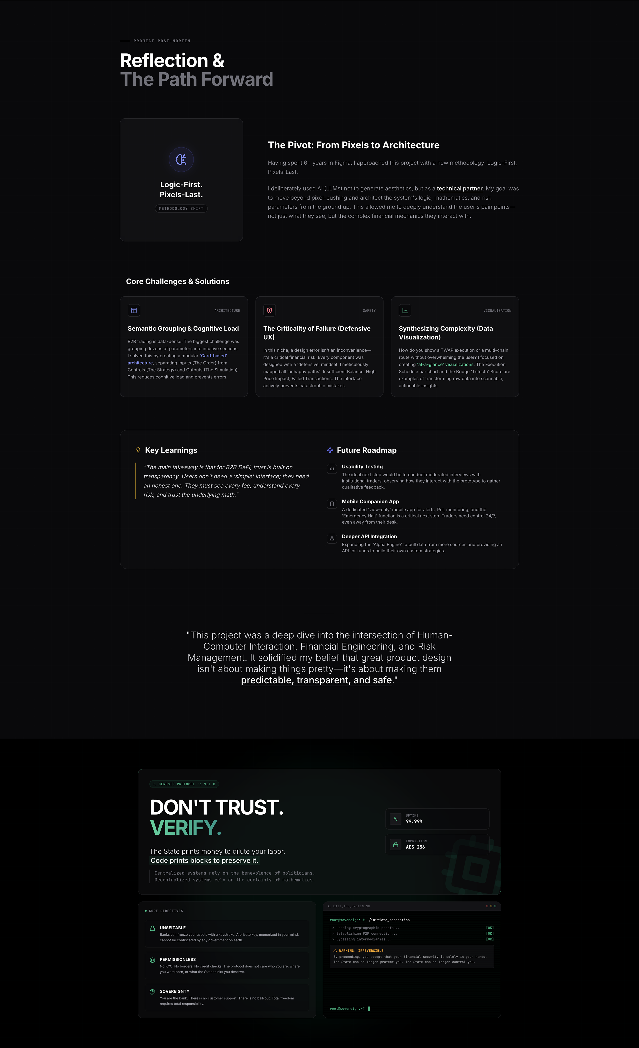 A comprehensive design for a unified DeFi Terminal. This project involved architecting a secure environment for algorithmic execution, risk governance, and real-time tax compliance.